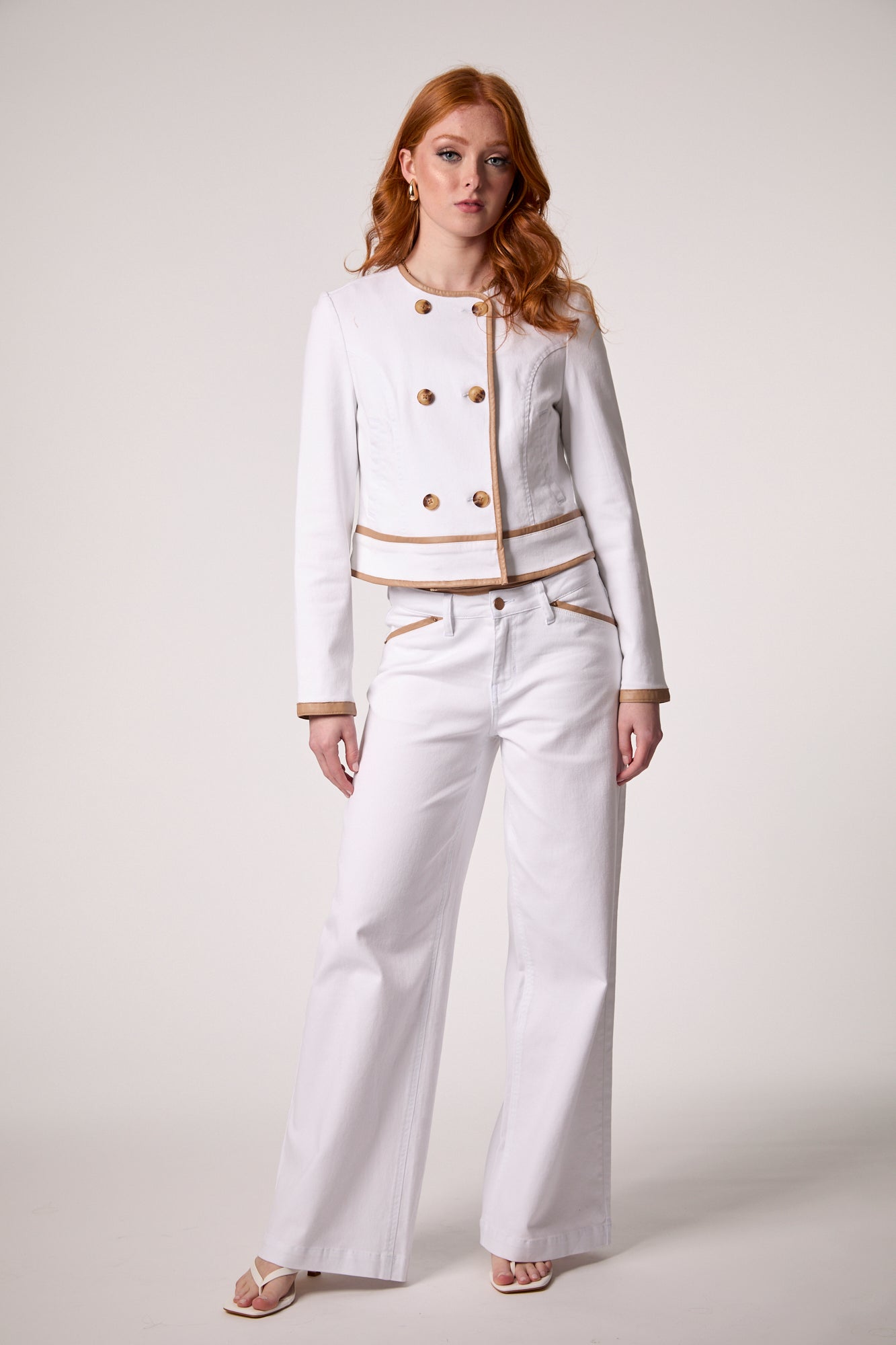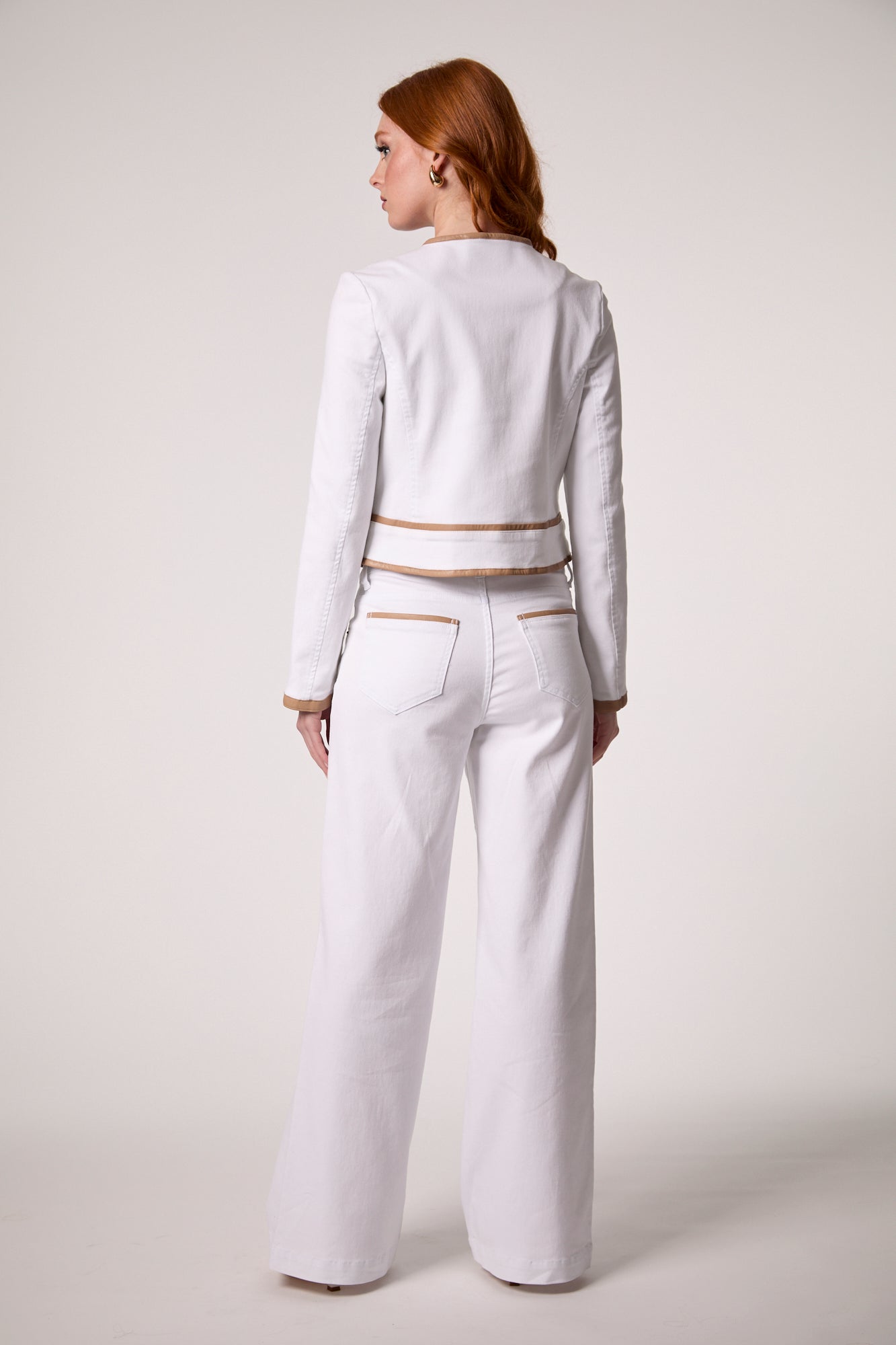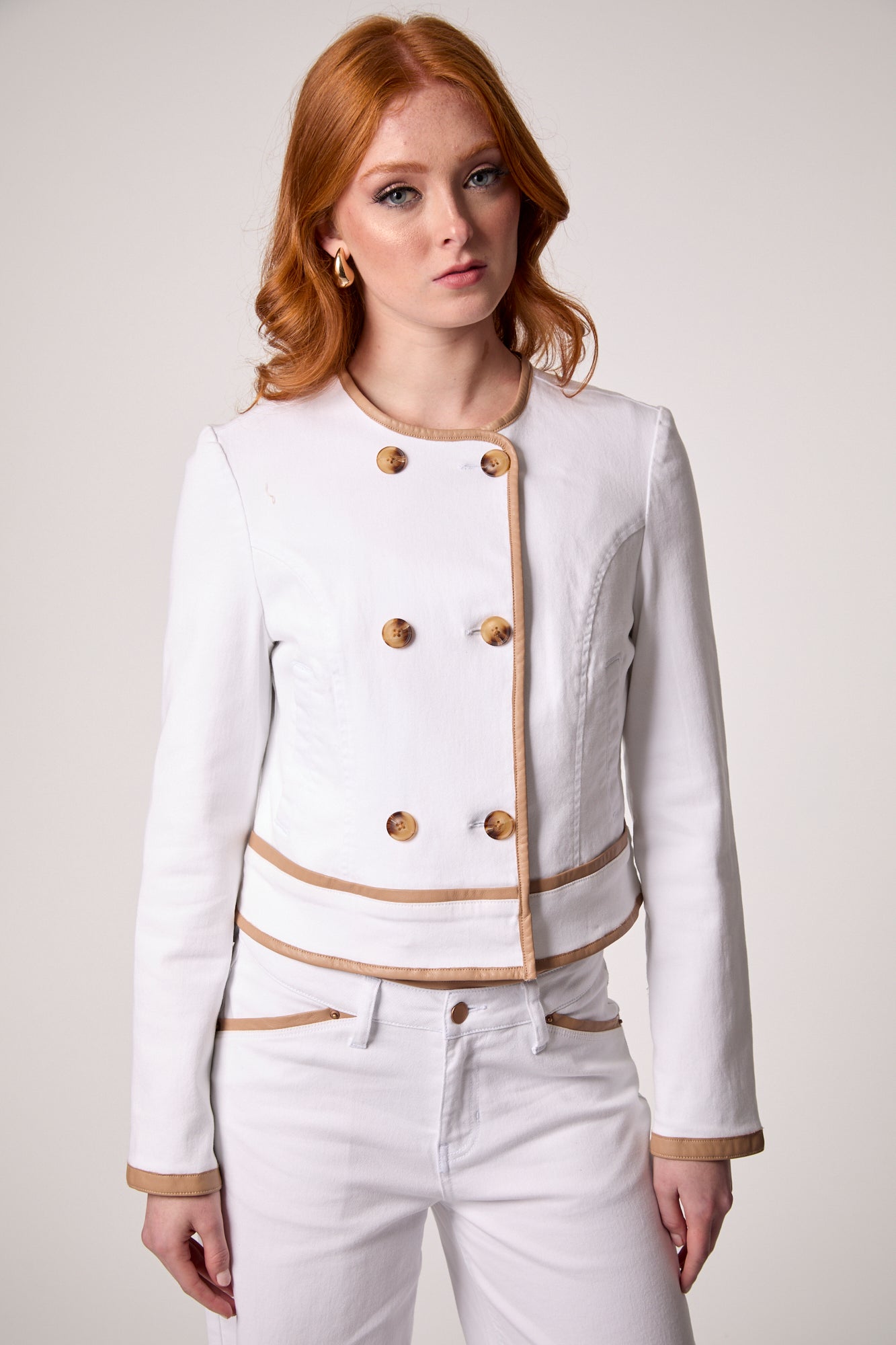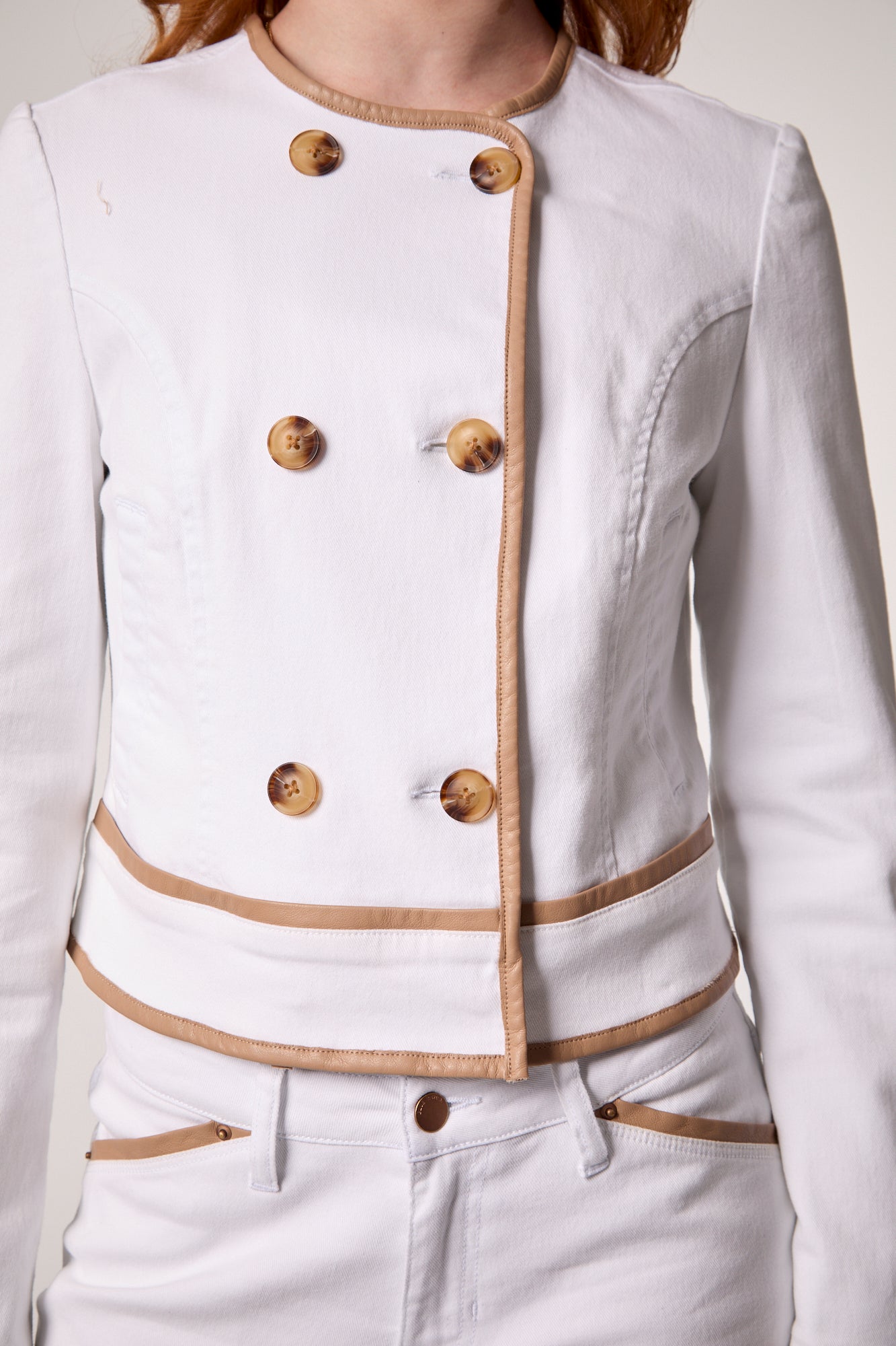 An elevated take on the denim jacket. Crafted in white denim with refined tan suede detailing, complete with brown button closures for a luxe finish.