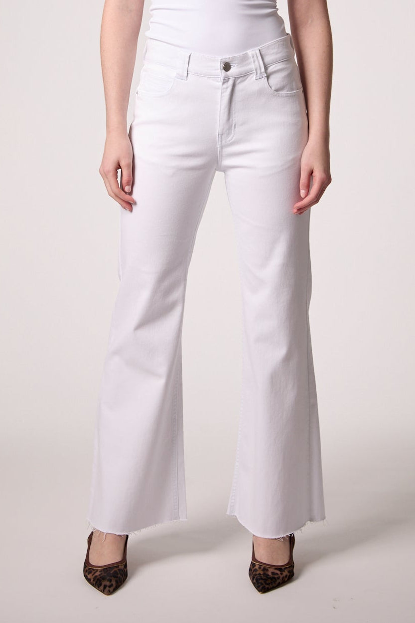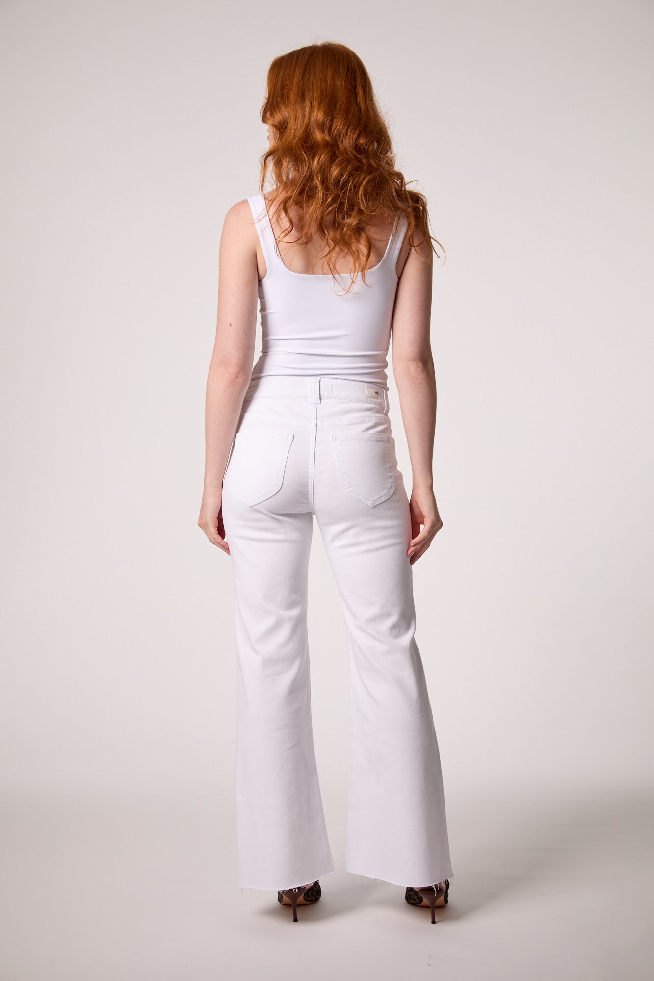 A sleek mid-rise palazzo pant in crisp white with a flowing wide-leg silhouette for an effortlessly polished look. Complete the all white look with the Piper Peplum Jacket.